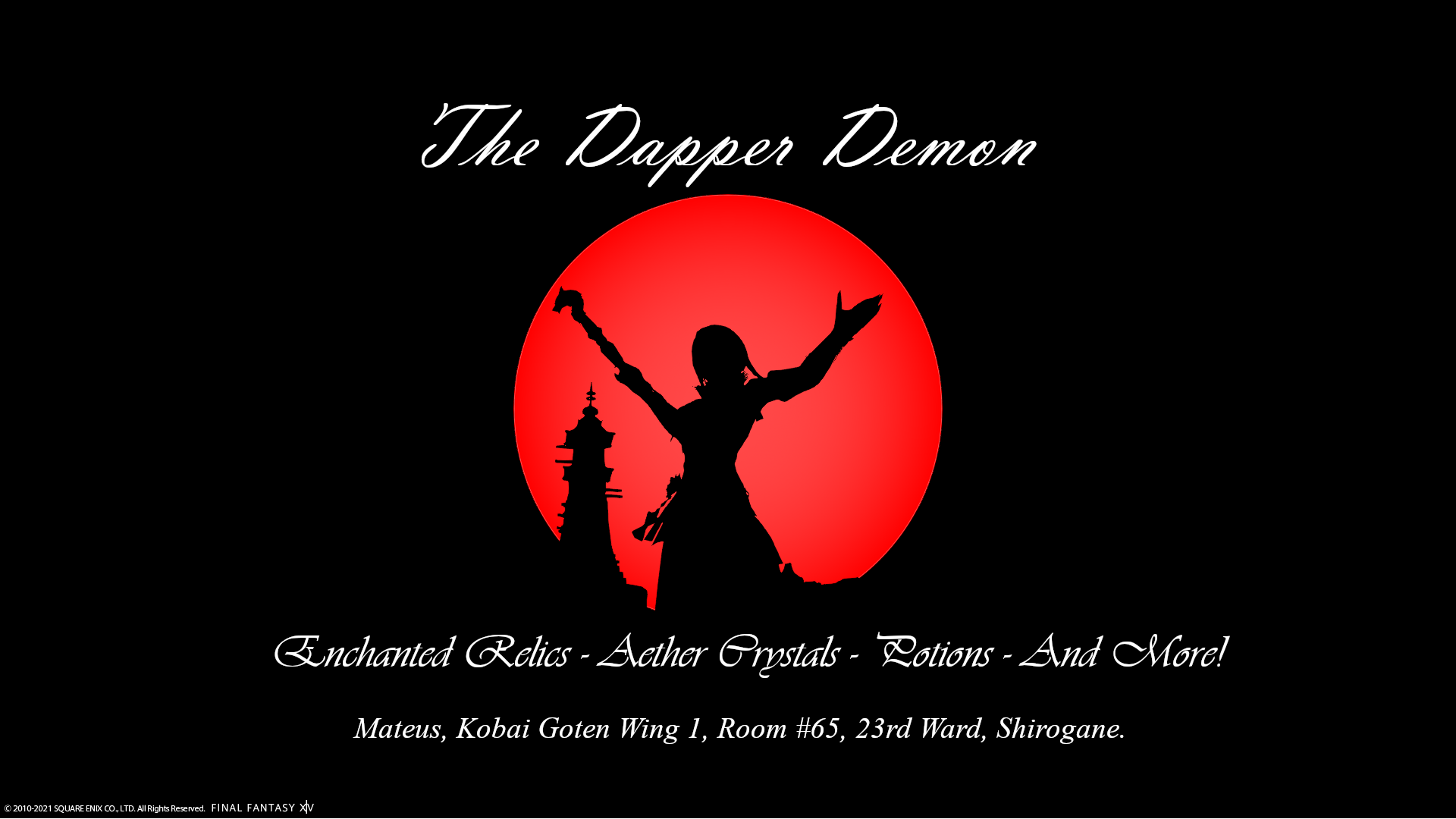 Avita's primary business and main source of income. The Dapper Demon is a host to an assortment of enchantments, and perhaps a few curses as well. Providing rare resources to mages from all walks of life, this hole-in-the-wall private market is worthwhile for any mage; from Novice, to Grandmaster.